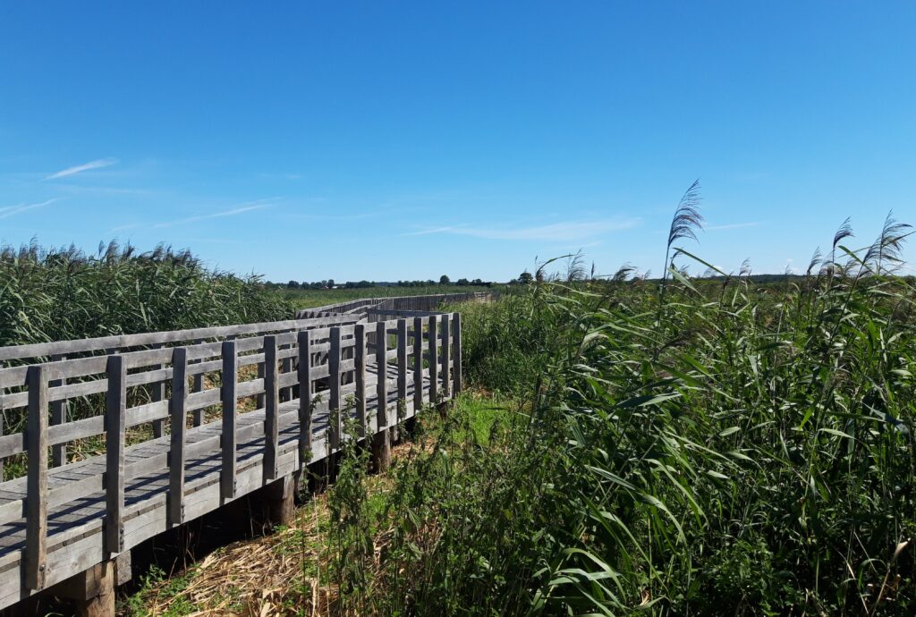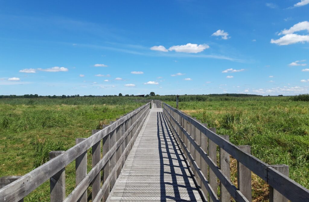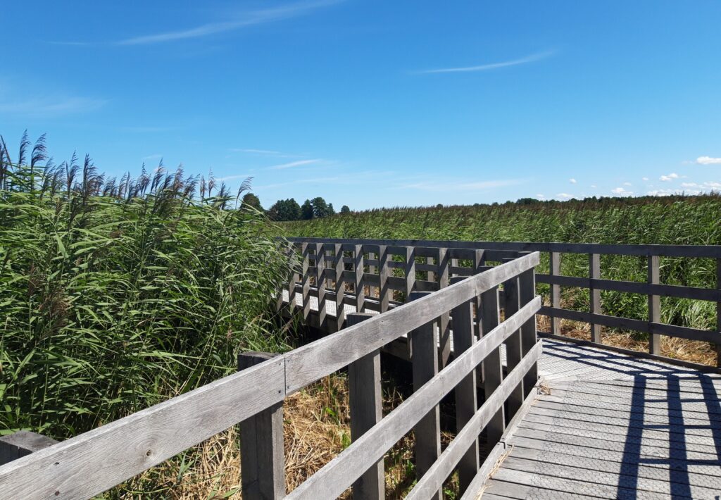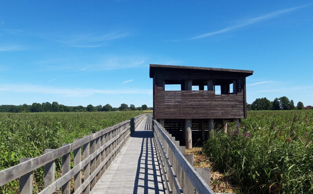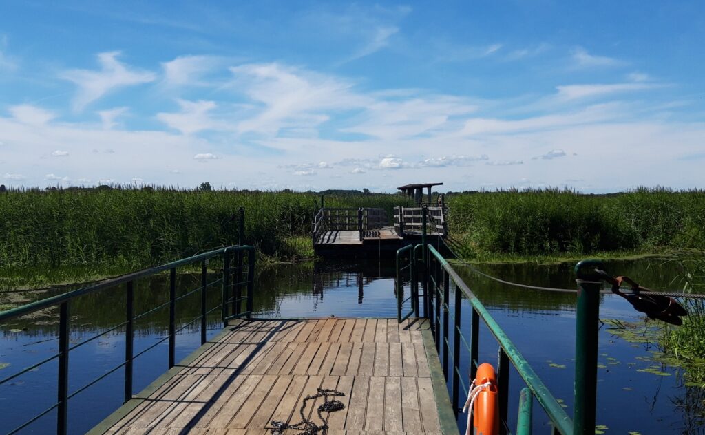 W ciągu kładki ustawiono dostrzegalnie ornitologiczne oraz wieżę widokową.